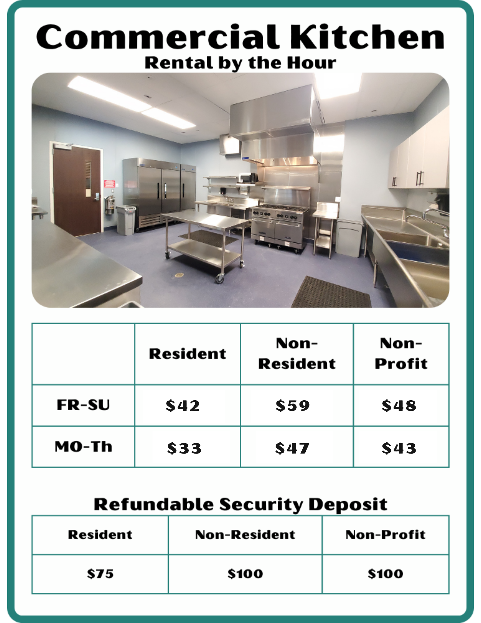 -The kitchen can be rented in addition to a Multi-Purpose Room, Gathering Space, or Gym Rental for an additional charge per hour with a 2 hour minimum.